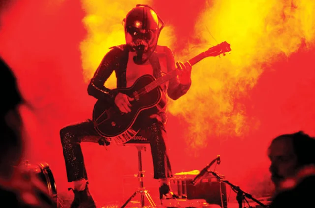 Bob Log III is an American slide guitar one-man band. During performances, he plays old Silvertone archtop guitars, wears a full body human cannonball suit, and a motorcycle helmet wired to a telephone receiver, which allows him to devote his hands and feet to guitar and drums. The spectacle has been described as a blues punk guitar dance party